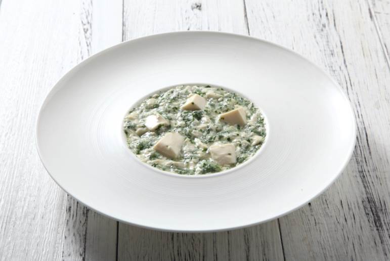 燒熱鍋加入上湯,鱈魚丁,薺菜末,調(diào)好味;