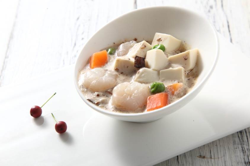 準(zhǔn)備: 豆腐切丁用開(kāi)水焯好待用;胡蘿卜、香菇切丁,和青豆、蝦仁用開(kāi)水焯好待用;